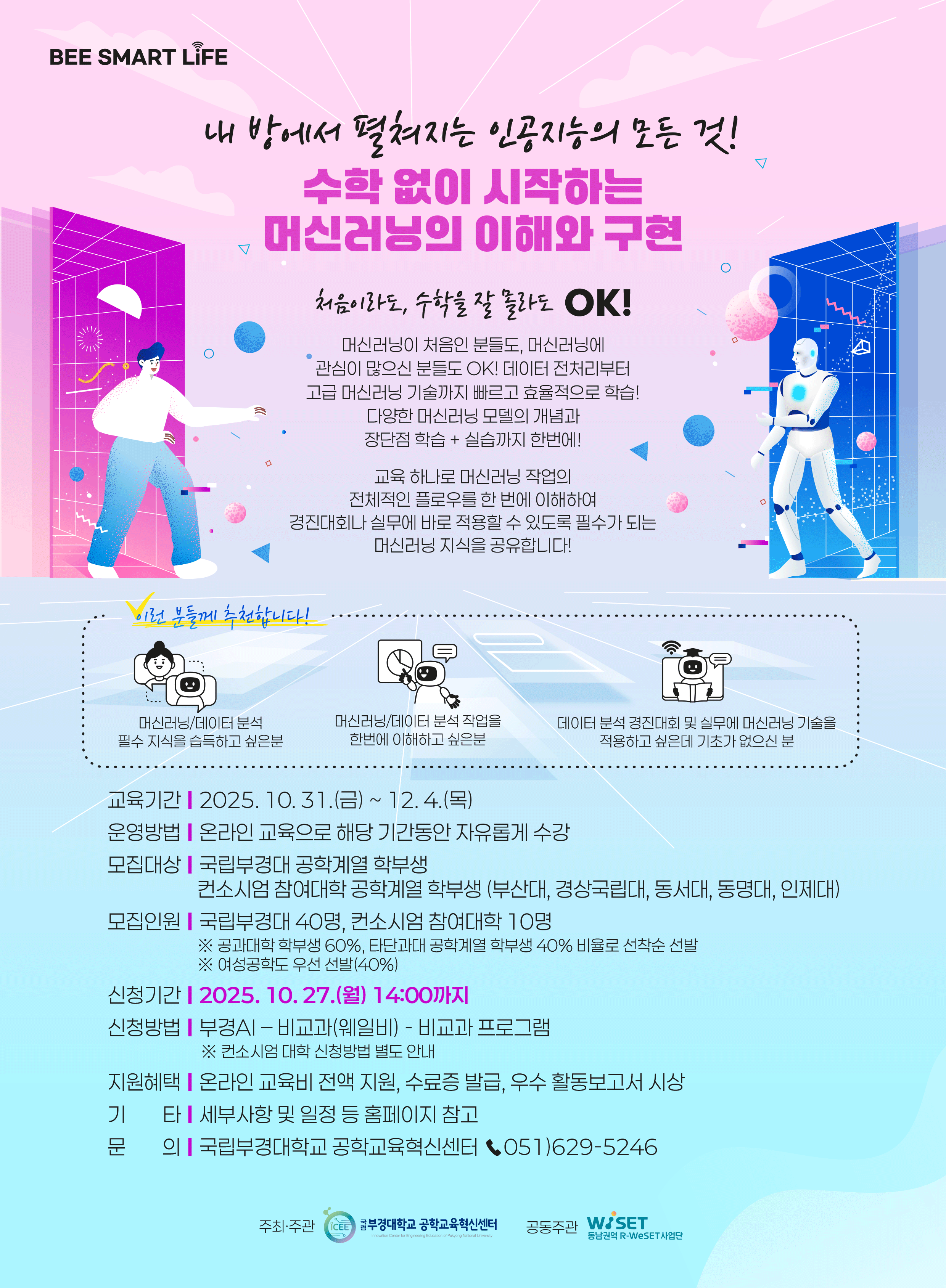 [국립부경대학교 공학교육혁신센터] 2025 내 방에서 펼쳐지는 인공지능의 모든 것! 수학없이 시작하는 머신러닝의 이해와 구현 참가학생 모집(~10/27(월), 14시)